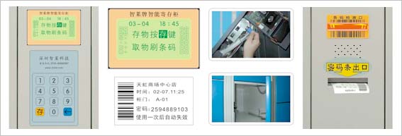 使用方法:由顾客先按键盘中的“存”键,寄存柜的控制系统针对某号箱随机产生一组10位数的开箱密码并将其打印在密码条上,同时附上对应的条码信息,当用户由密码条出口取出它时,寄存柜会自动弹开该箱门,用户将物品放入箱中关好箱门后。取物时只需将条码图形靠近条码检测口(或通过键盘正确输入该组10位数密码)即可打开该箱,且条码使用一次后自动失效。