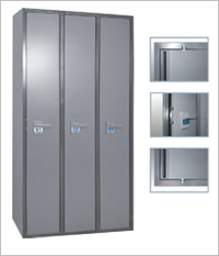 警械寄存柜主要特点: ★三个方向10mm直径插销。 ★电信号控制开门旋转把手。 ★门框内插销到位开关。 ★把手旋转提示灯。 ★箱内装有红外探测器。