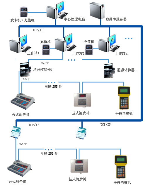 通迅转换器:有两种转换器、可选两种中任一种,消费机与电脑线路中间的一个设备,485转232转换器用来将消费机485信号转换成电脑能够接受的232信号,电脑上需有232串口;485转TCP/IP协议转换器将消费机485转成ICT/IP协议信号,通过电脑网线接口进行通信。