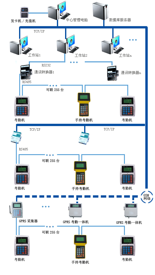 我公司的考勤系统可与自身研发的考勤机、GPRS采集器、GPRS考勤一体机等多种硬件相互组合,选择一种适合企业自身的考勤模式